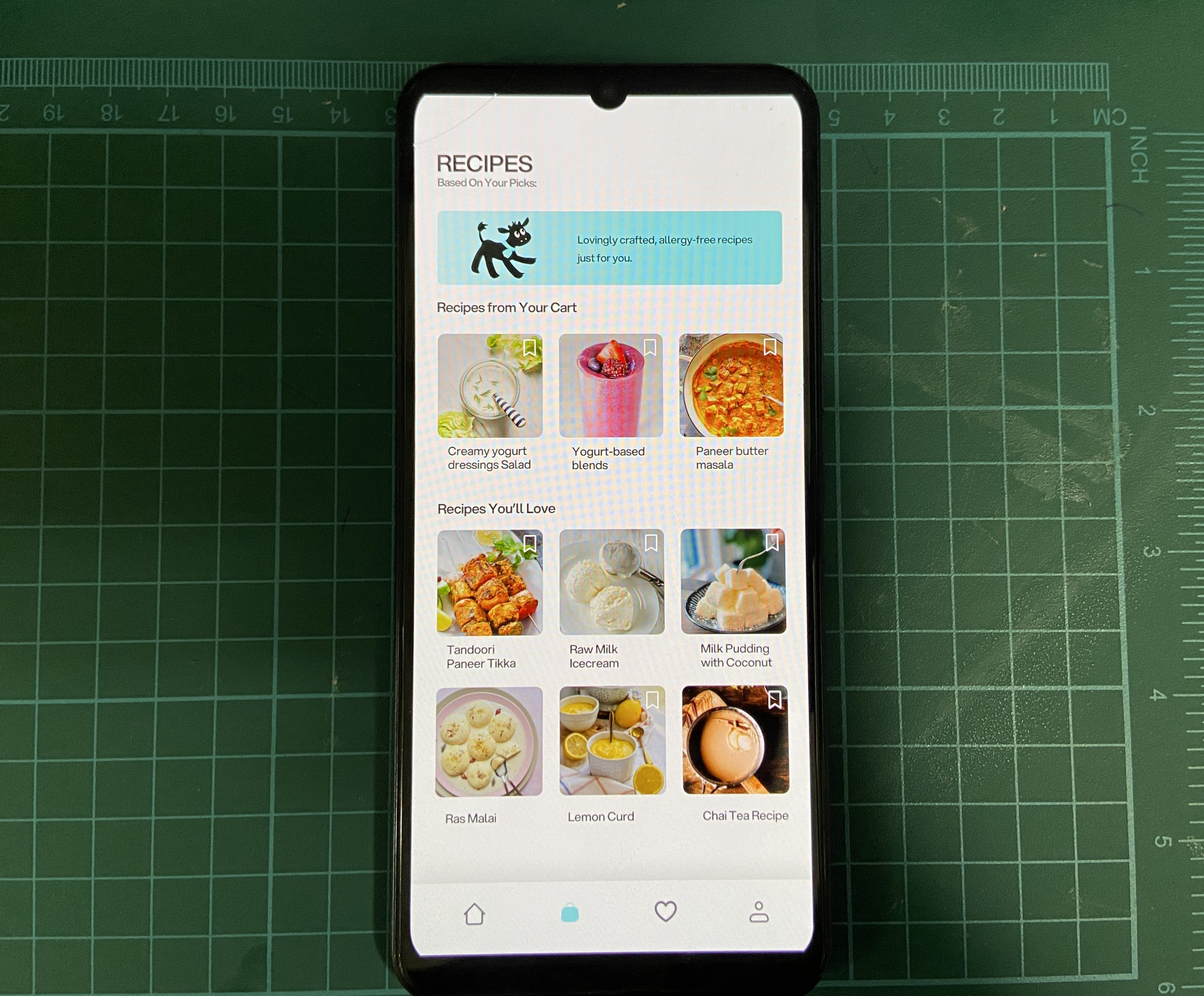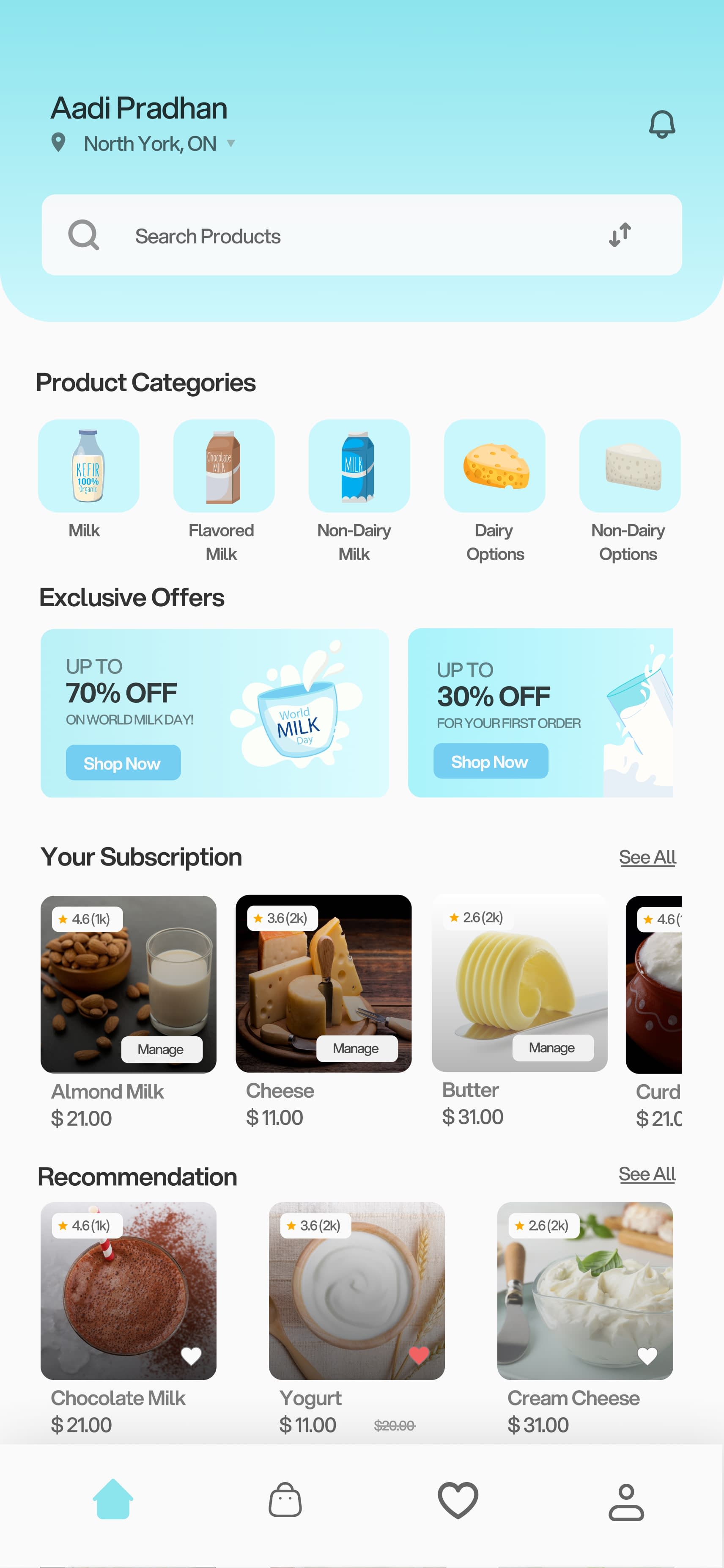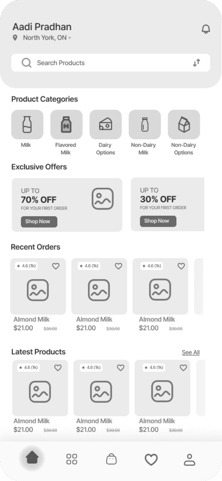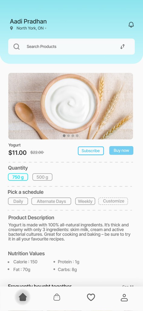 The homepage greets you with a personalized touch, displaying your name and address for a seamless experience. A search bar simplifies navigation, while curated product categories, exclusive offers, and subscription recommendations align with your preferences. By leveraging your sign-up information, the app also filters out items that may trigger allergies or harm your health, ensuring a safe, tailored shopping journey.