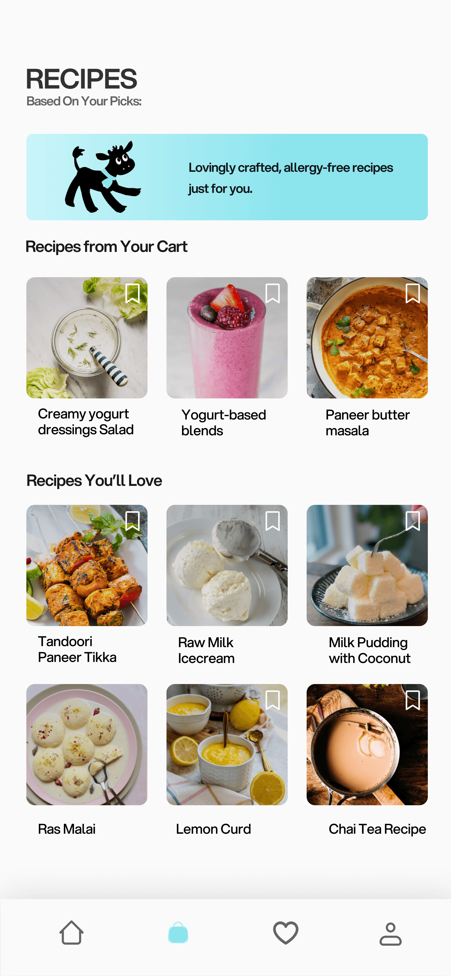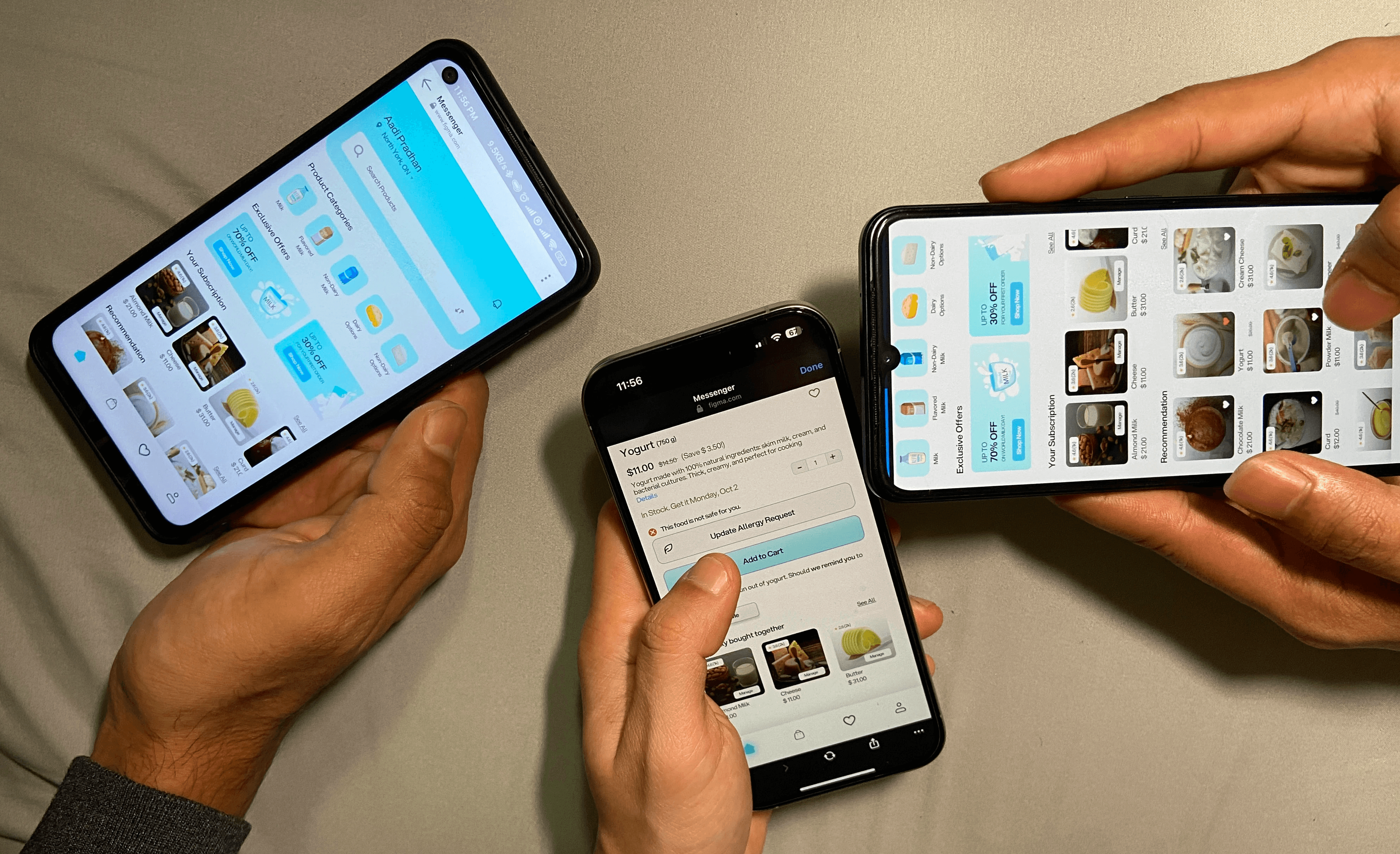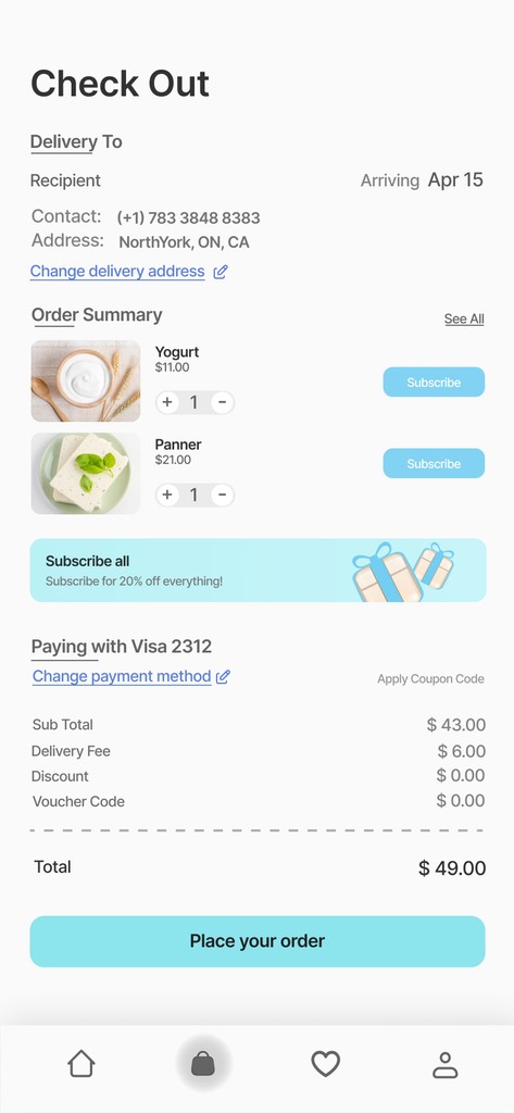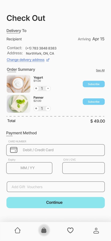 The homepage greets you with a personalized touch, displaying your name and address for a seamless experience. A search bar simplifies navigation, while curated product categories, exclusive offers, and subscription recommendations align with your preferences. By leveraging your sign-up information, the app also filters out items that may trigger allergies or harm your health, ensuring a safe, tailored shopping journey.