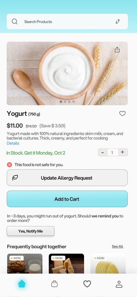 Safe products are marked with a green tick and a reassurance message. Users can browse images, search for other items, and update allergies. A notification feature alerts you when you're running low, while the wishlist and "Frequently Bought Together" sections streamline shopping, making the experience seamless and personalized.