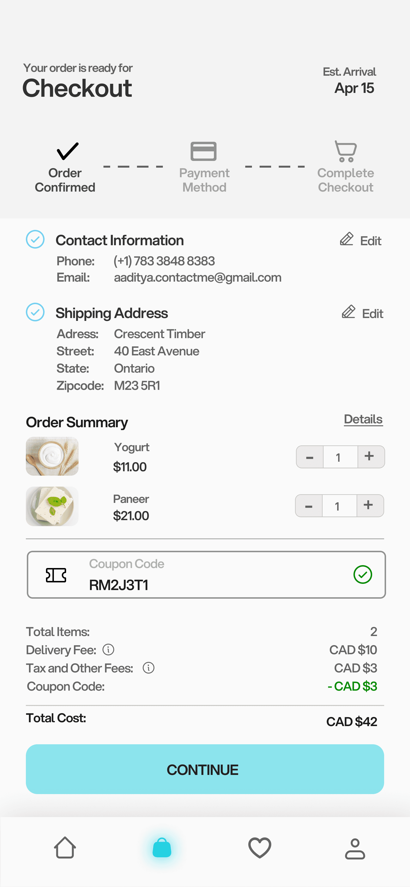 The checkout page shows estimated arrival time and offers simple options to update contact, address, and payment details. Users can adjust quantities, apply coupon codes, and complete their purchase seamlessly for a smooth, efficient experience.
