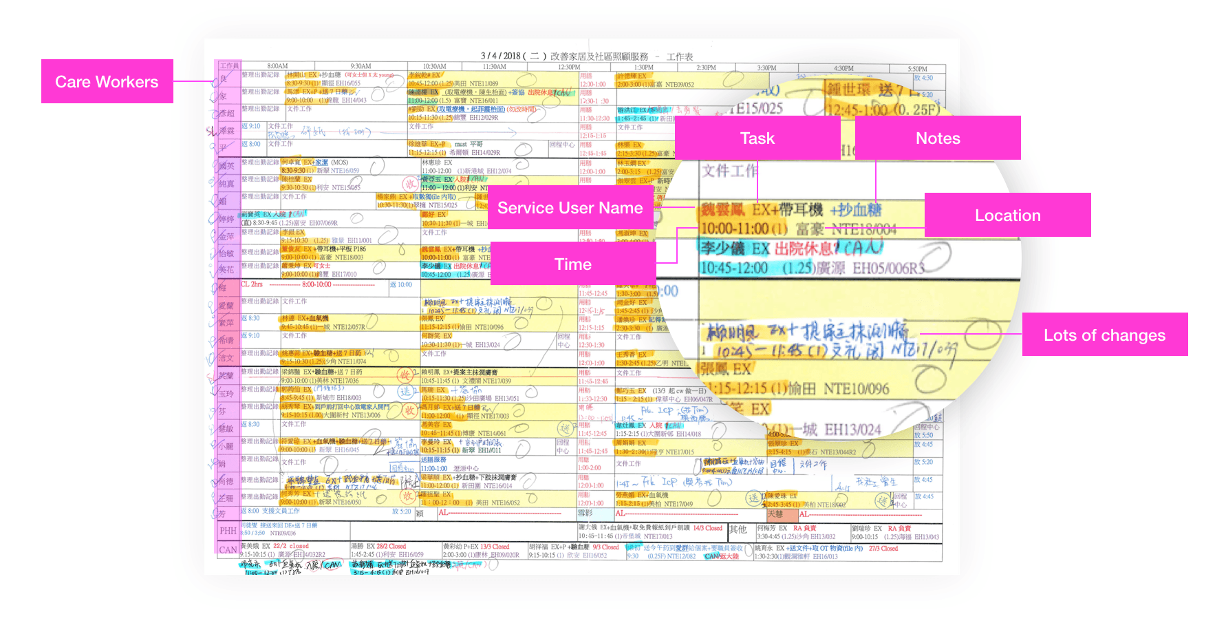 Front-line case workers need to visit several seniors to provide different services everyday. The shift and service details always keep changing. They had to check the updated schedule everyday on a paper posted in the NGO center.